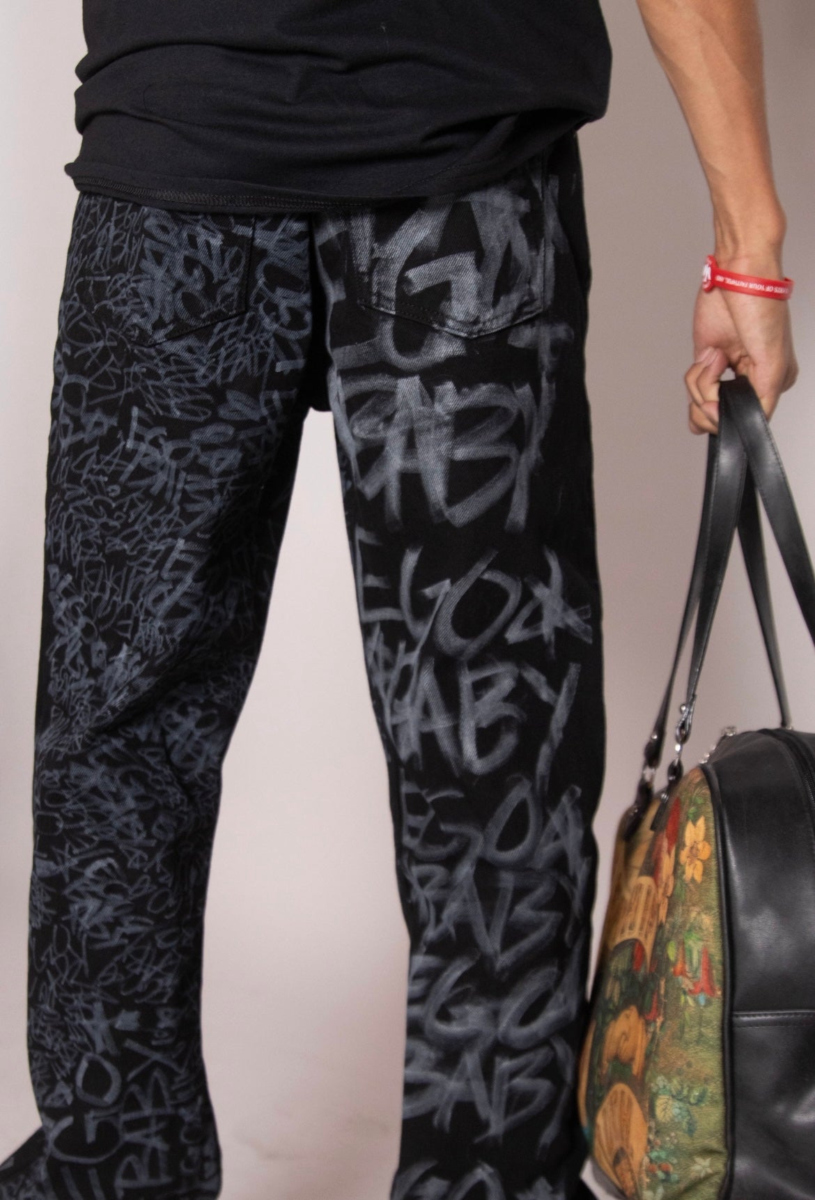 Crafted with precision and luxury in mind, the unisex EGO BABY 1-1 marked black denim pants feature a hand-written EGOBABY logo repeated over 100 times. Made from premium denim, these pants make a statement of quality and style.